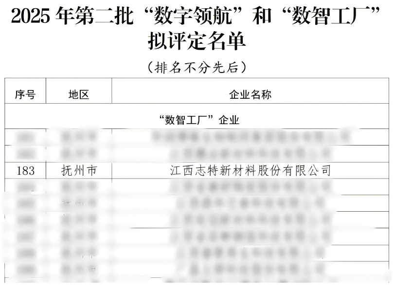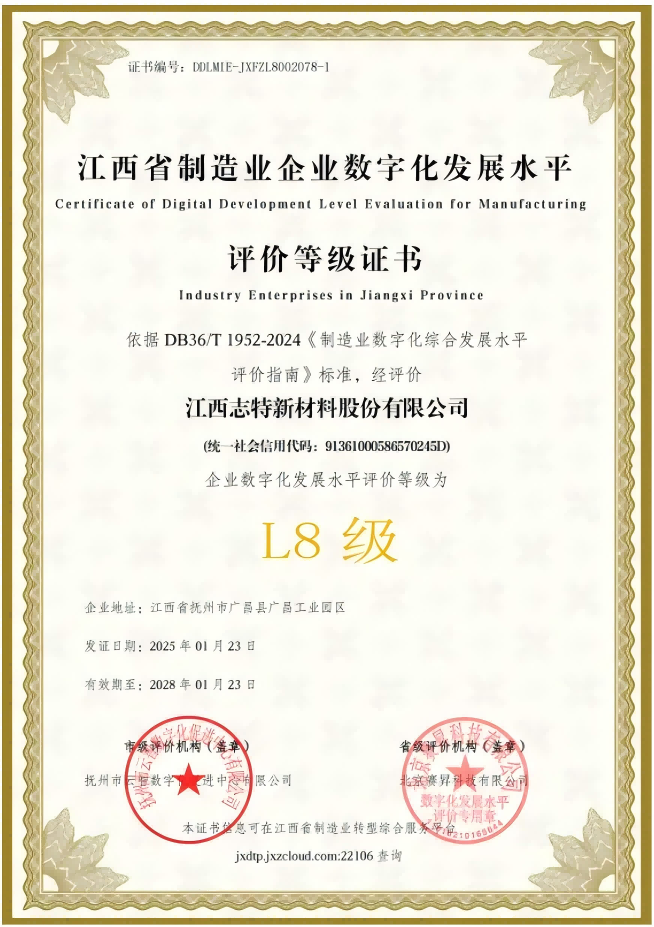 近日,志特新材(股票代码:SZ 300986)凭借在数字化领域的深度实践与显著成效,荣获江西省“数智工厂”认定。这是继今年4月公司获评“数字化转型L8贯标奖”后在数字化转型道路上获得的又一重要省级荣誉。该奖项由江西省工业和信息化厅主导评定,标志着企业在智能制造能力成熟度、数字技术融合应用等维度达到行业领先水平。